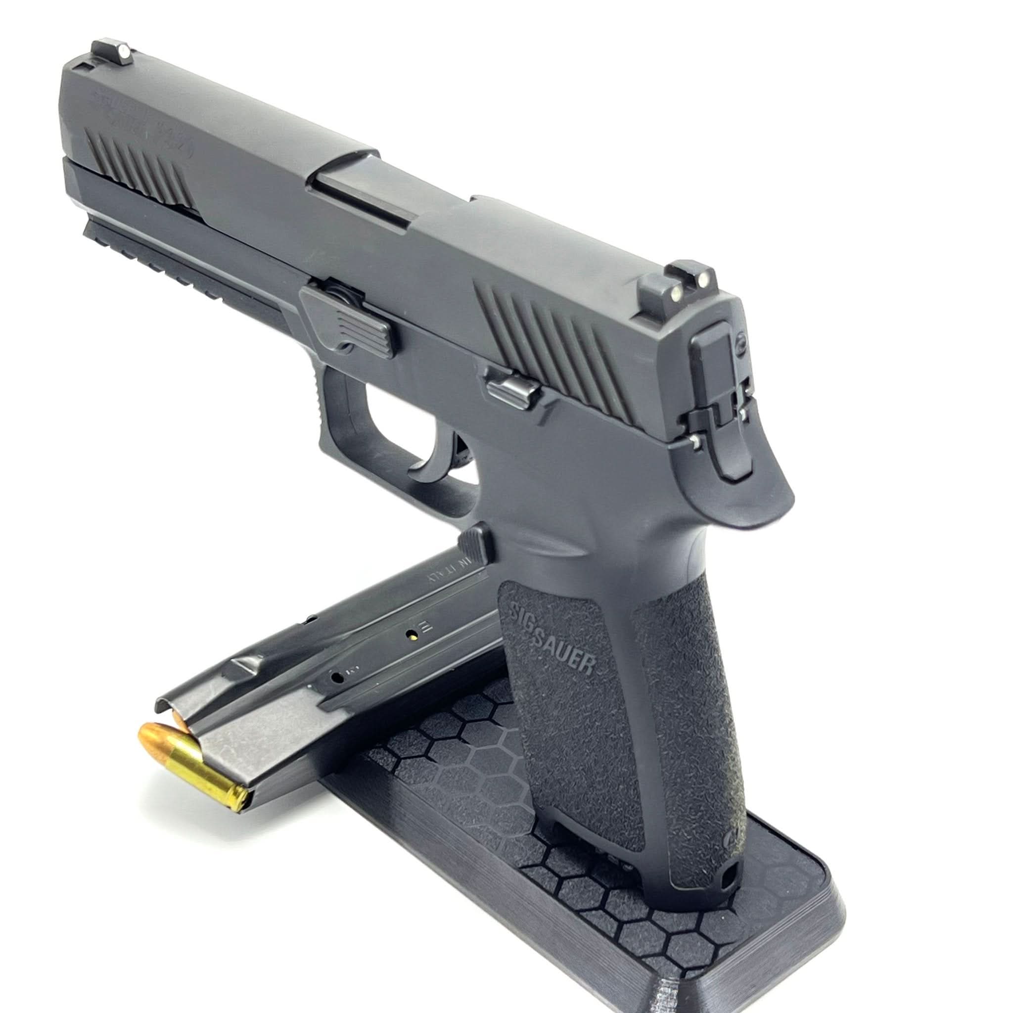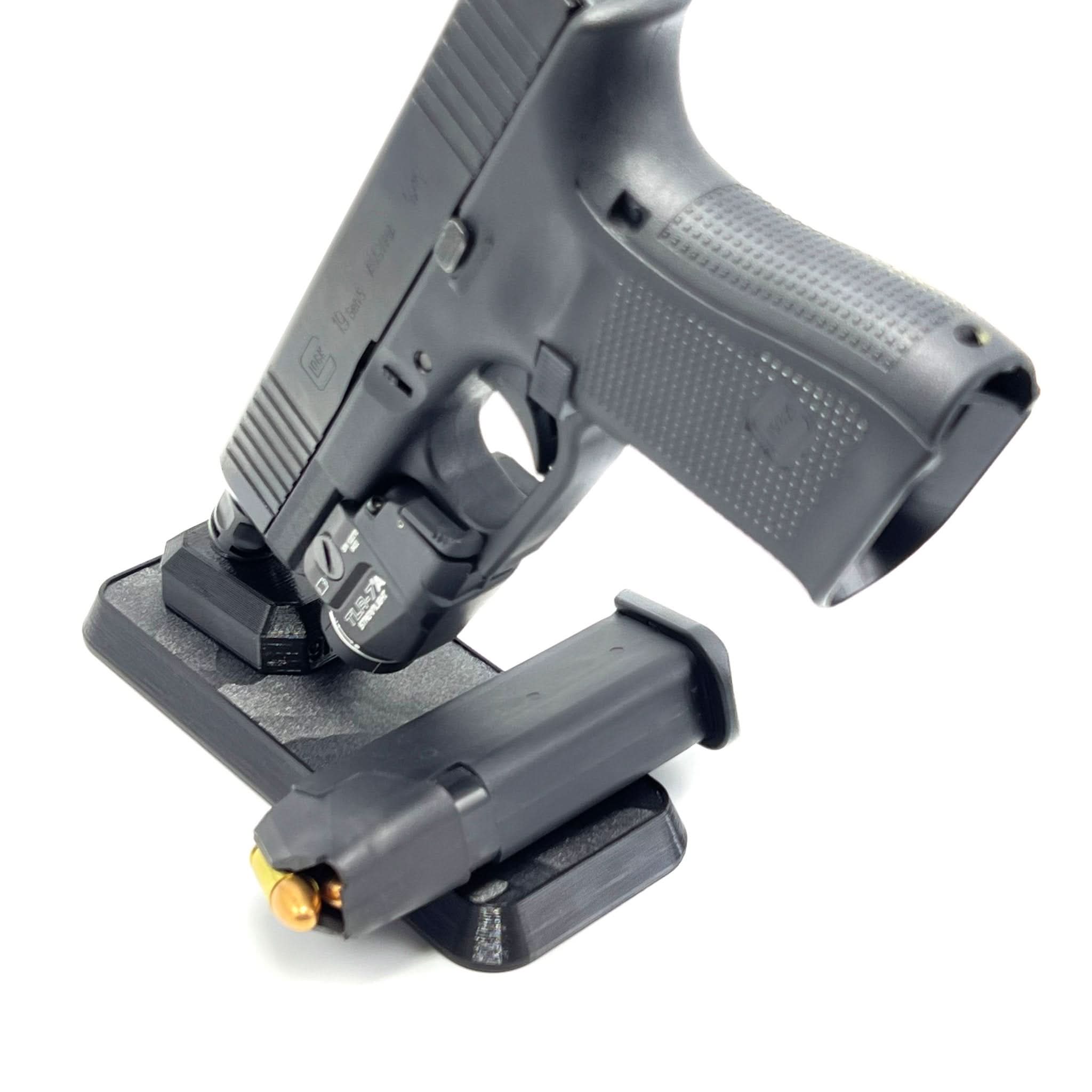 Show off your favorite sidearm with our precision-fit pistol display stand, designed to hold your handgun upright, level, and secure on any flat surface. Whether it’s for a gun safe, shop counter, or collector’s shelf, this stand offers clean organization and fast access. Includes a built-in magazine slot and optional color accents. Built tough in the USA for proud owners and professional presentations.